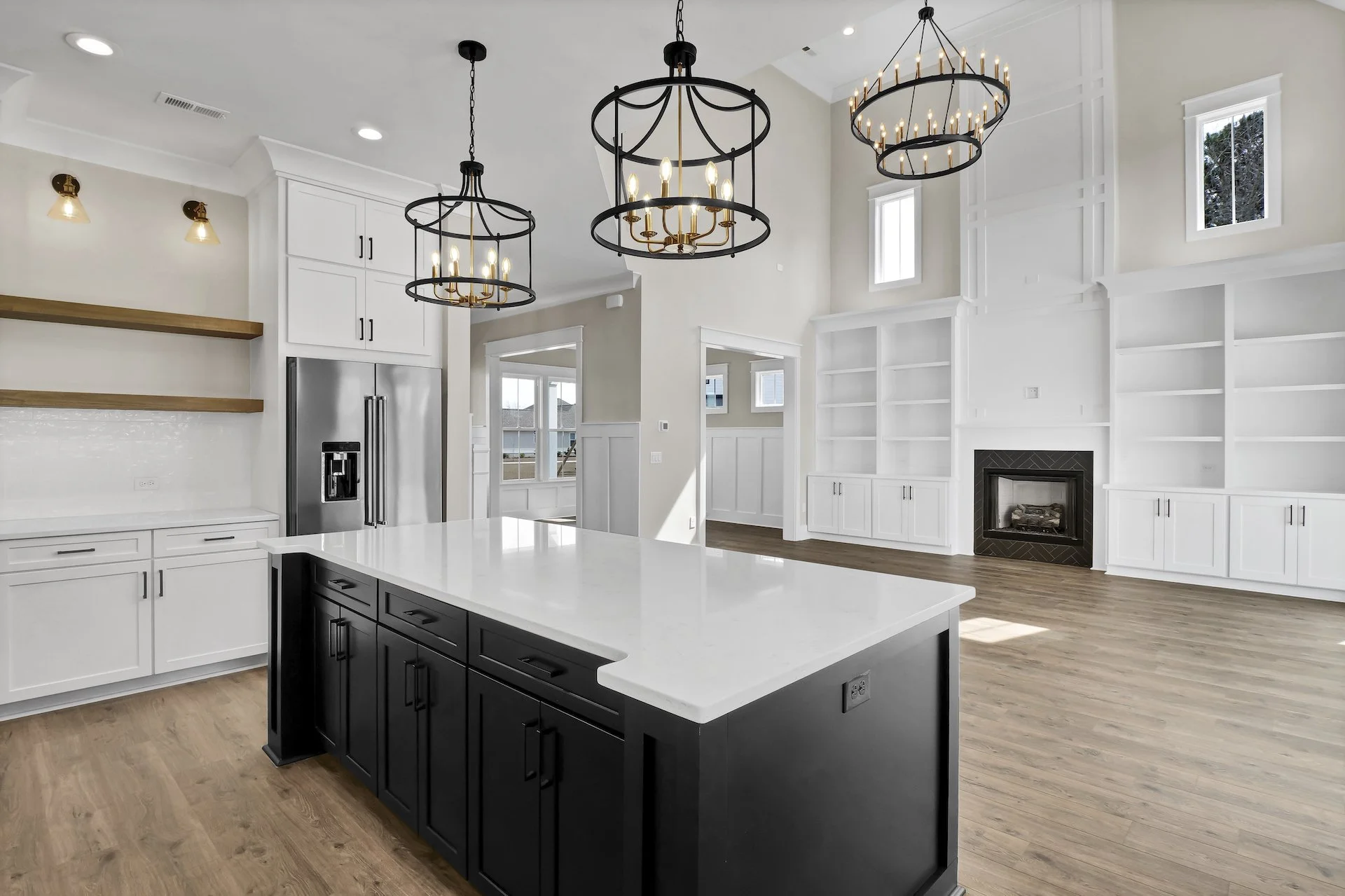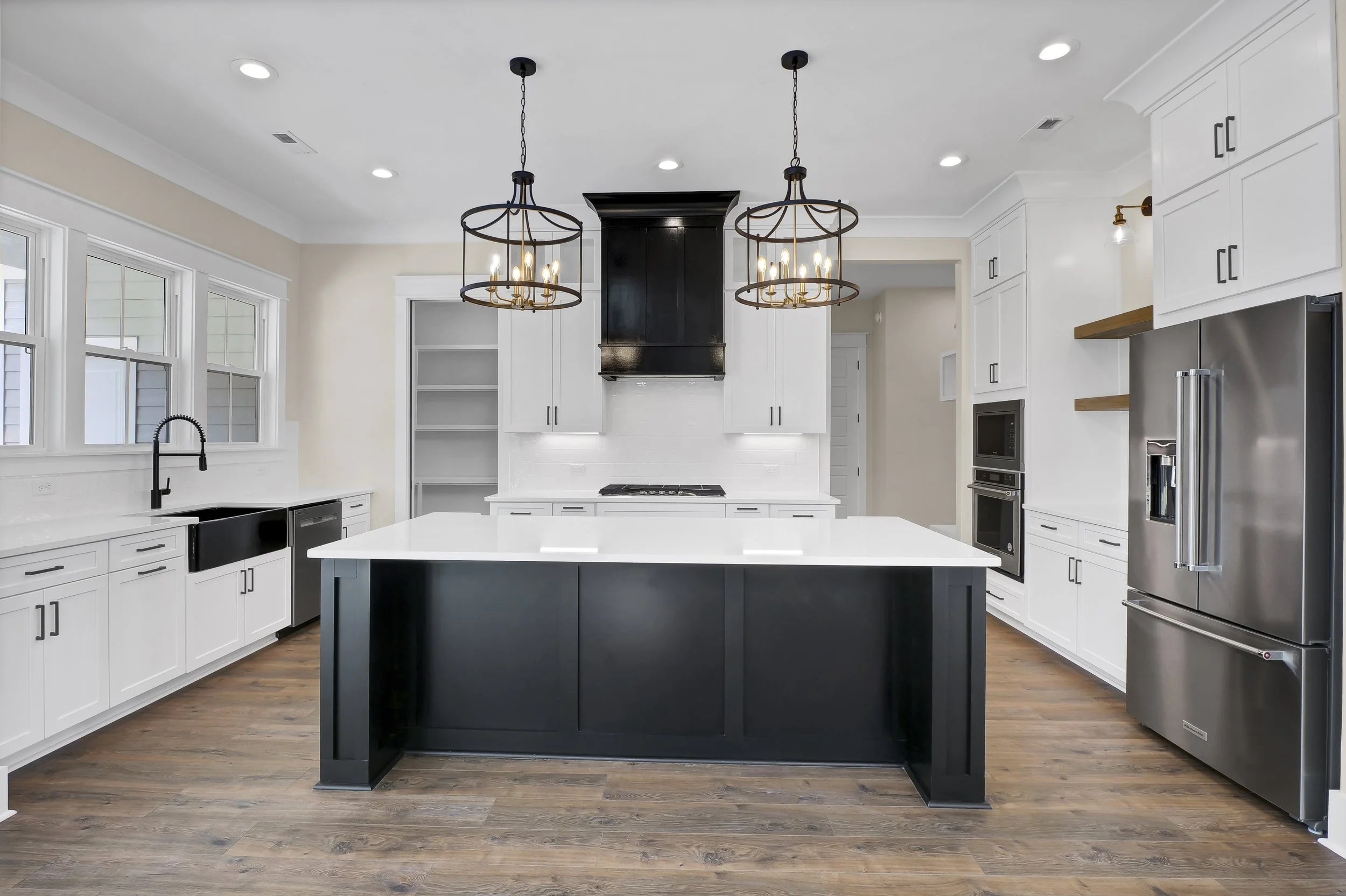 The kitchen in this custom-built home by Channel Marker Builders features our Waypoint Cabinetry collection in Painted Linen and Black. Stunning features of this kitchen include a beautiful black farmhouse sink by Ruvati, natural open shelving, matte black hardware, and traditional subway tile. The bathroom features stunning Maple Rye cabinetry in the master and upstairs bath, with painted harbor and black in the others. This home is perfectly nestled in treelined property, ready for this family to enjoy life on the Eastern North Carolina coast.