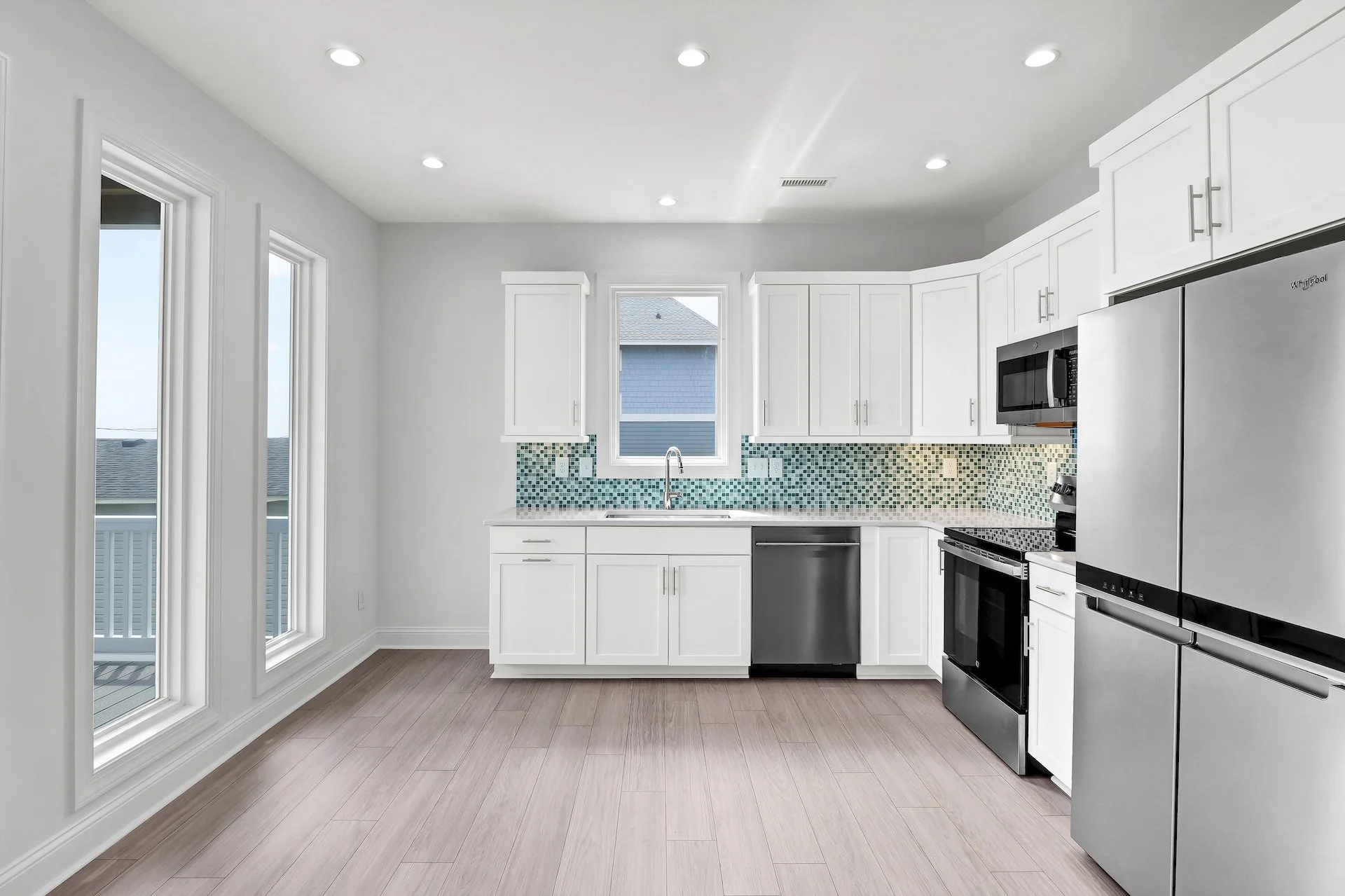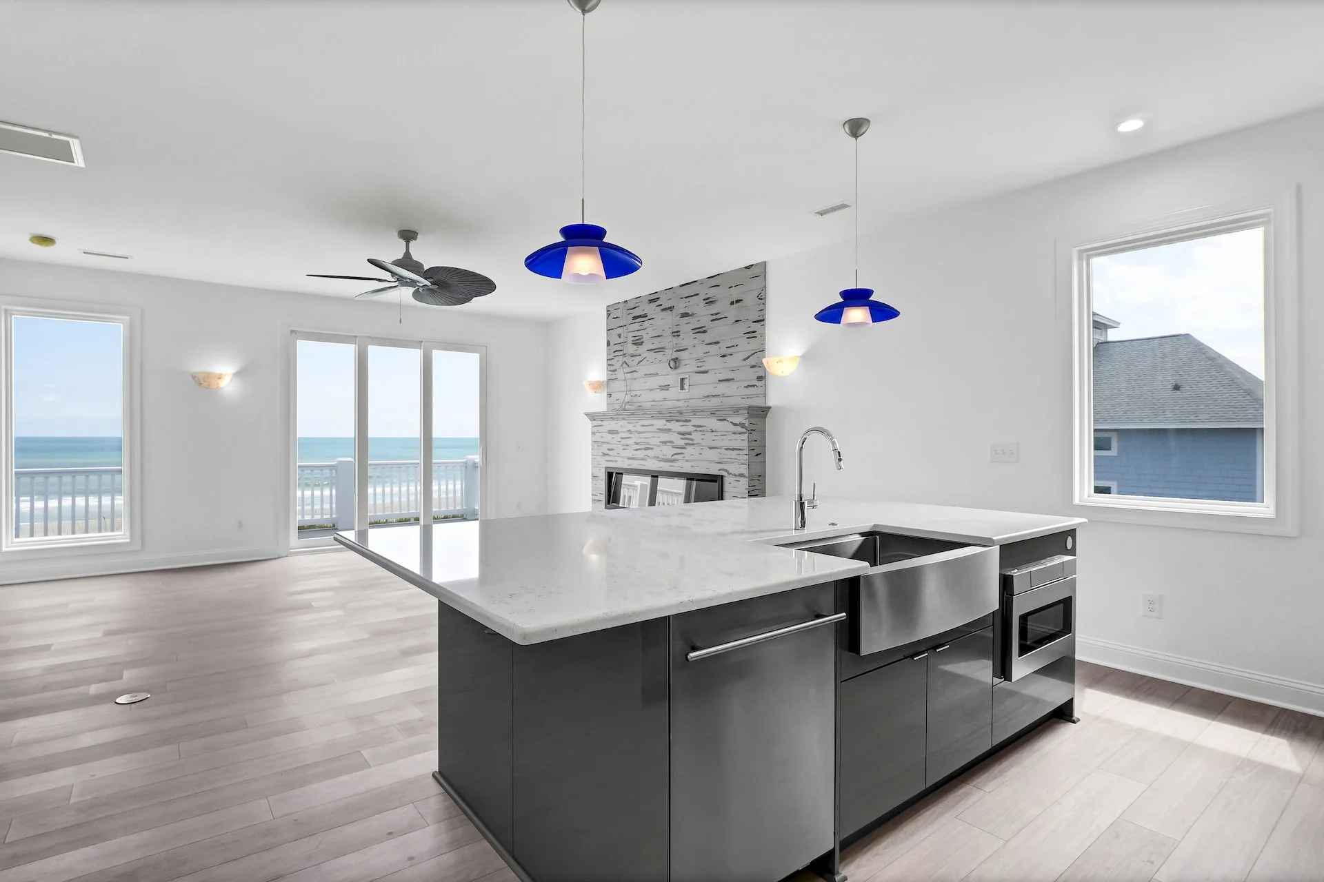 This custom home by OQuinn Builders in Eastern North Carolina checks all the coastal boxes. This homeowner split their unit into two properties, allowing for two unique kitchen concepts on North Topsail Island. The cabinetry selections are from our Fabuwood and Waypoint Living Spaces collections. The Fabuwood Illume Catalina Bianco Gloss & Illume Catalina Grigio Gloss is on the upper floor. Downstairs, you’ll see the Painted Linen color from the Waypoint collection. Hardware is from Hardware Resources, with countertops from Treasure Stone Granite. Completing the kitchen is the beautiful farmhouse sink from Ruvati.