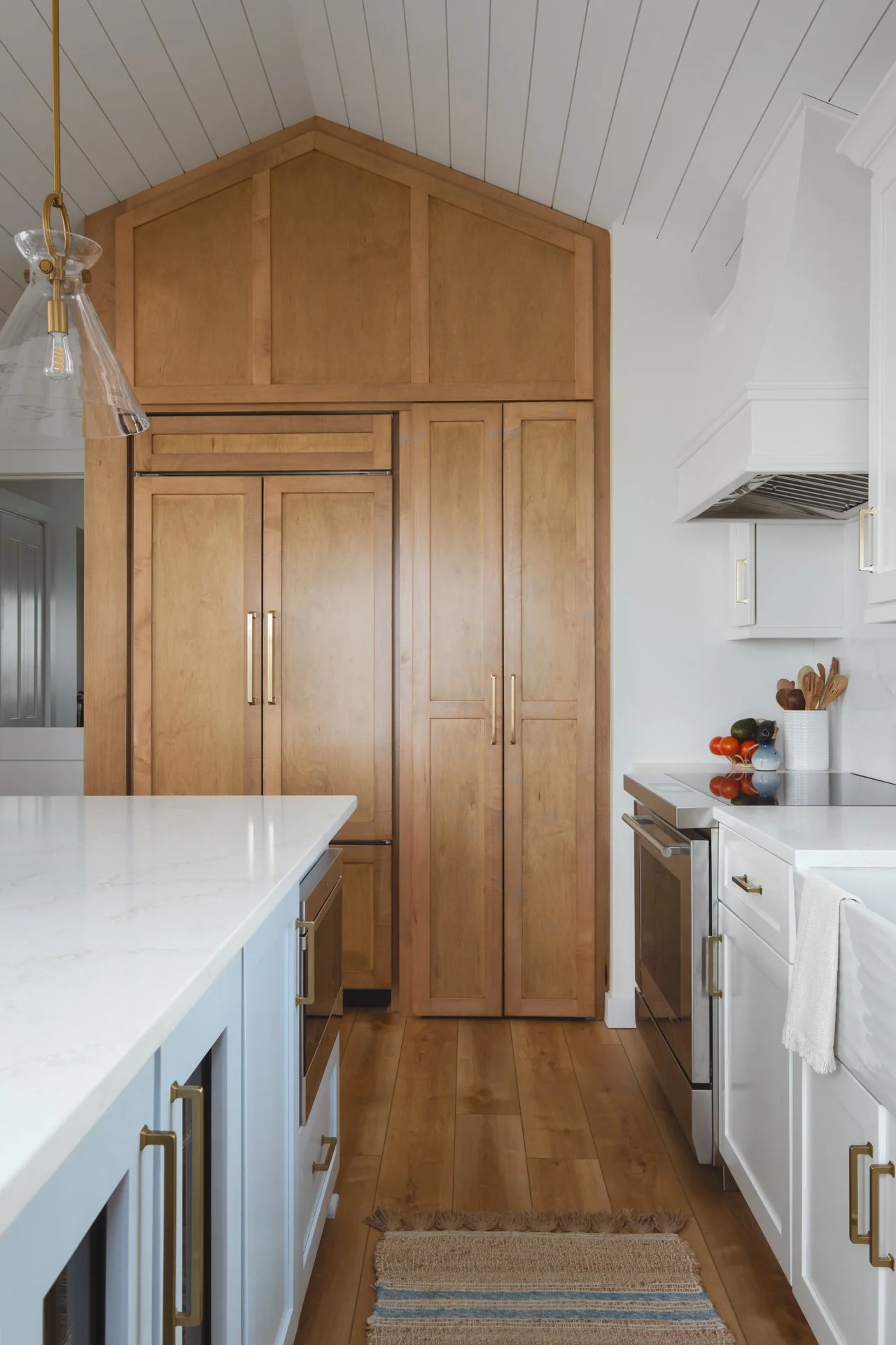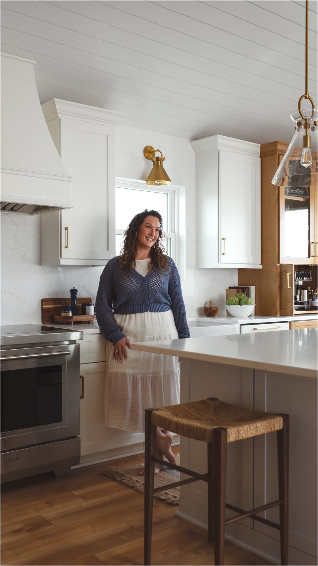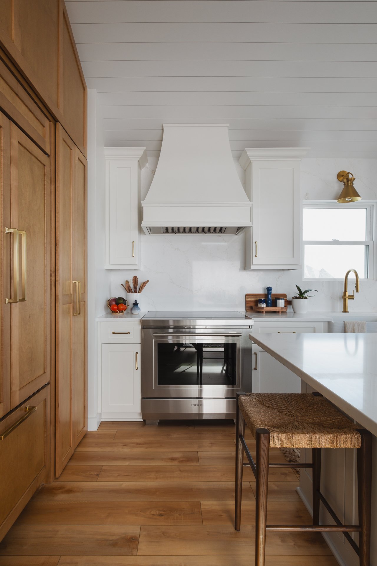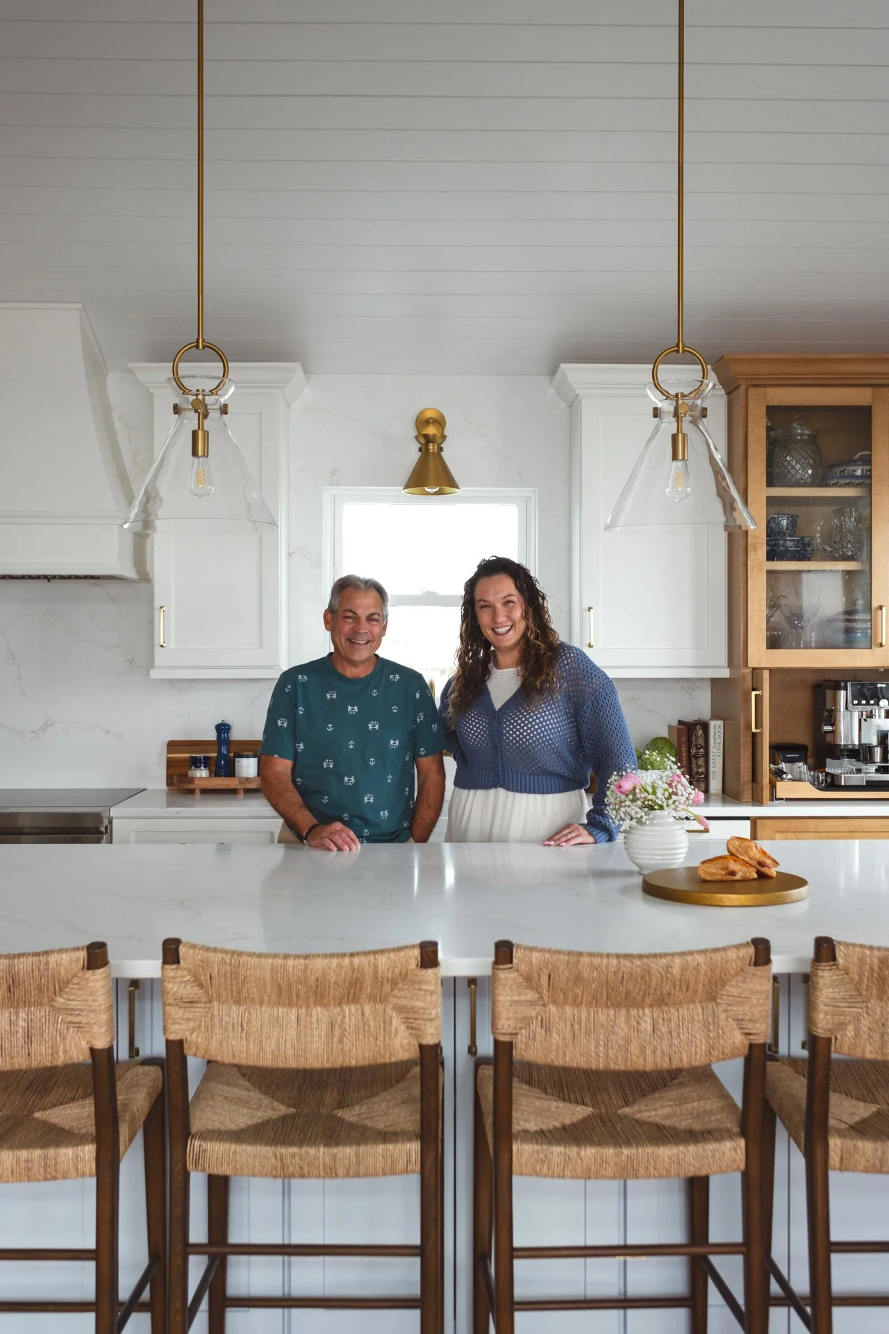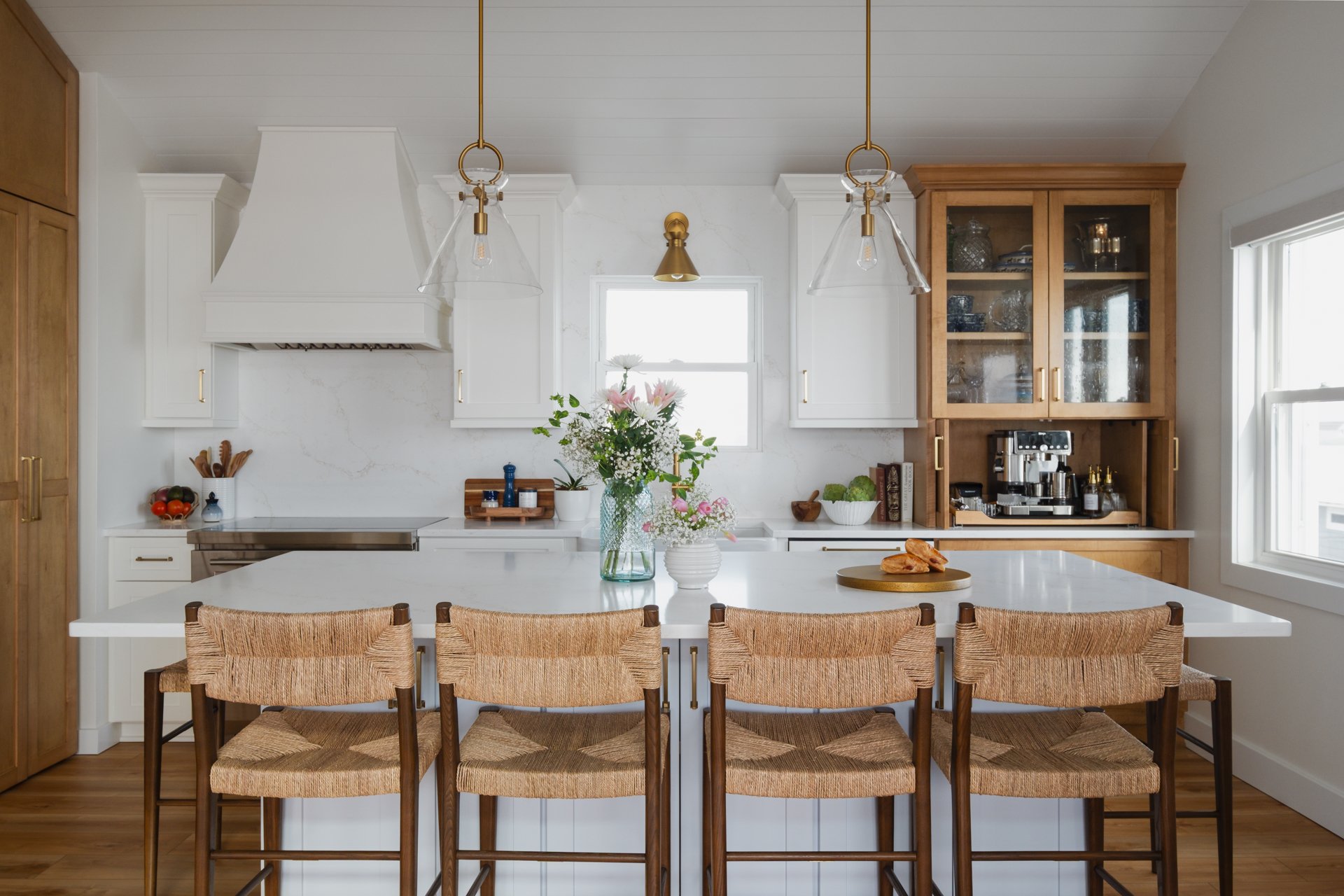 This Surf City kitchen may be small, but it works overtime. Waypoint Cabinetry in Maple Rye and Dove creates a natural two-tone palette, while concealed storage, seamless appliances, and thoughtful solutions make everyday living feel effortless — proving that a well-designed kitchen doesn't need to be large to be exceptional. Cambria Icelandic quartz countertops and a full-height quartz backsplash keep the space bright and airy, while Top Knobs hardware in Honey Bronze adds a warm metallic detail that complements the natural wood tones throughout. Woven rush barstools, a shiplap ceiling, and brass pendant lighting complete the relaxed coastal character — warm, livable, and perfectly at home on the North Carolina coast.