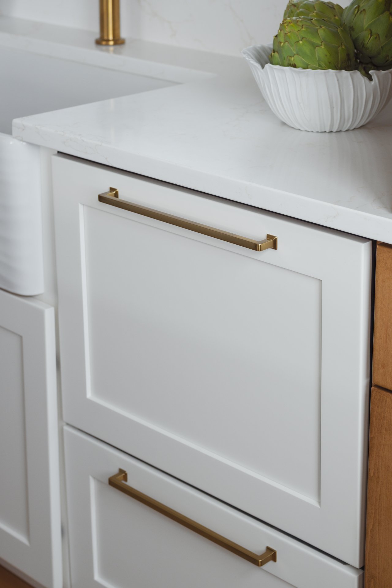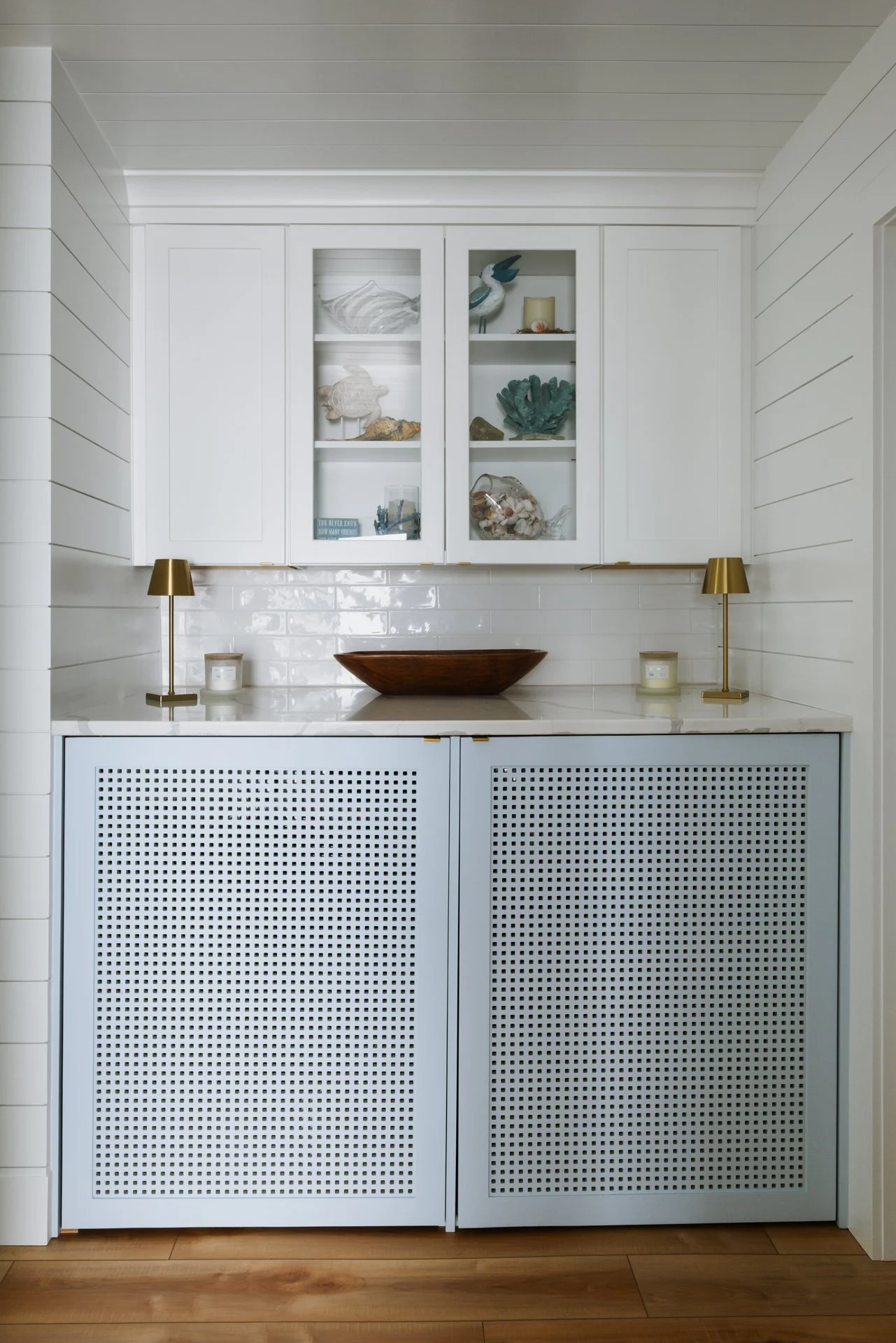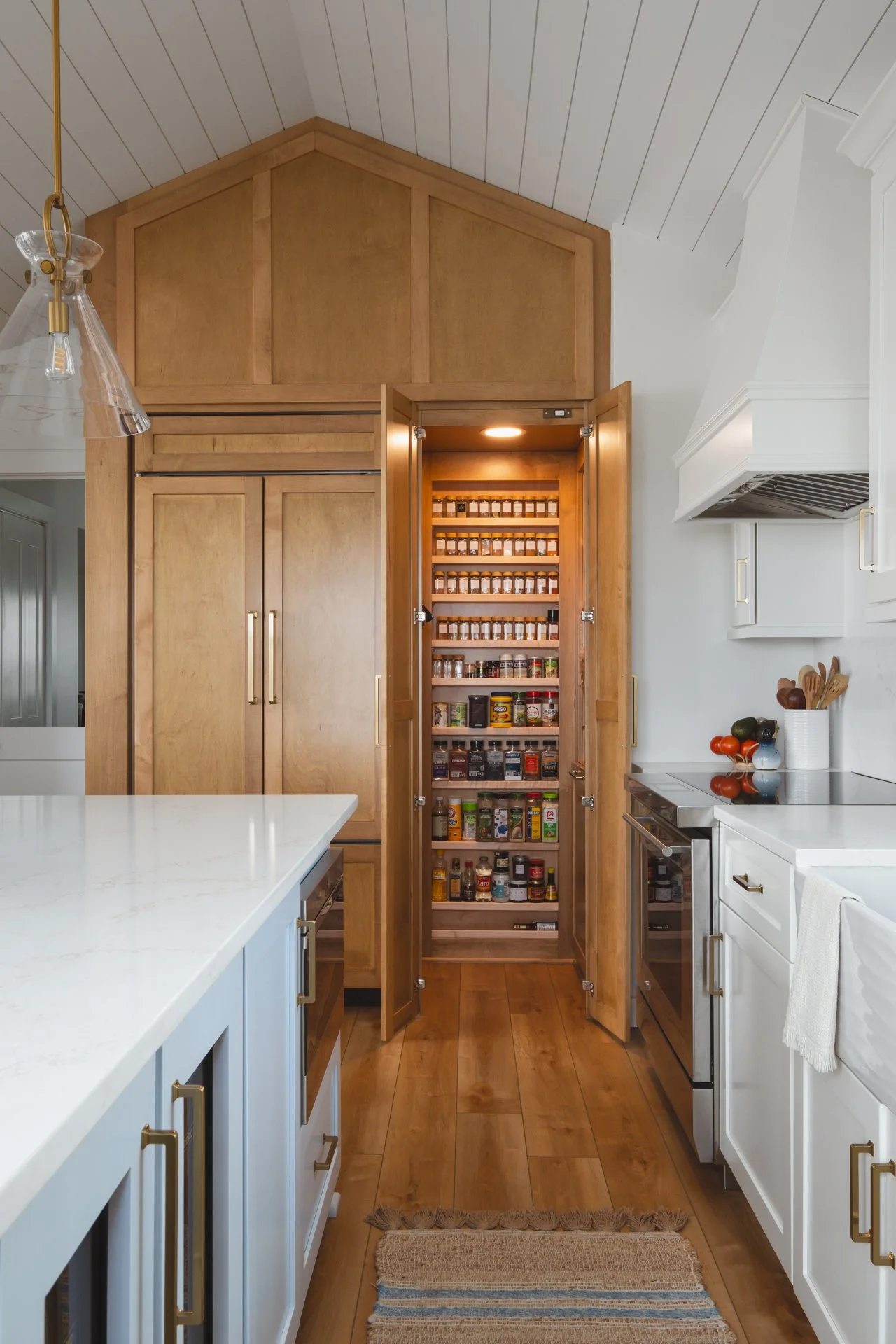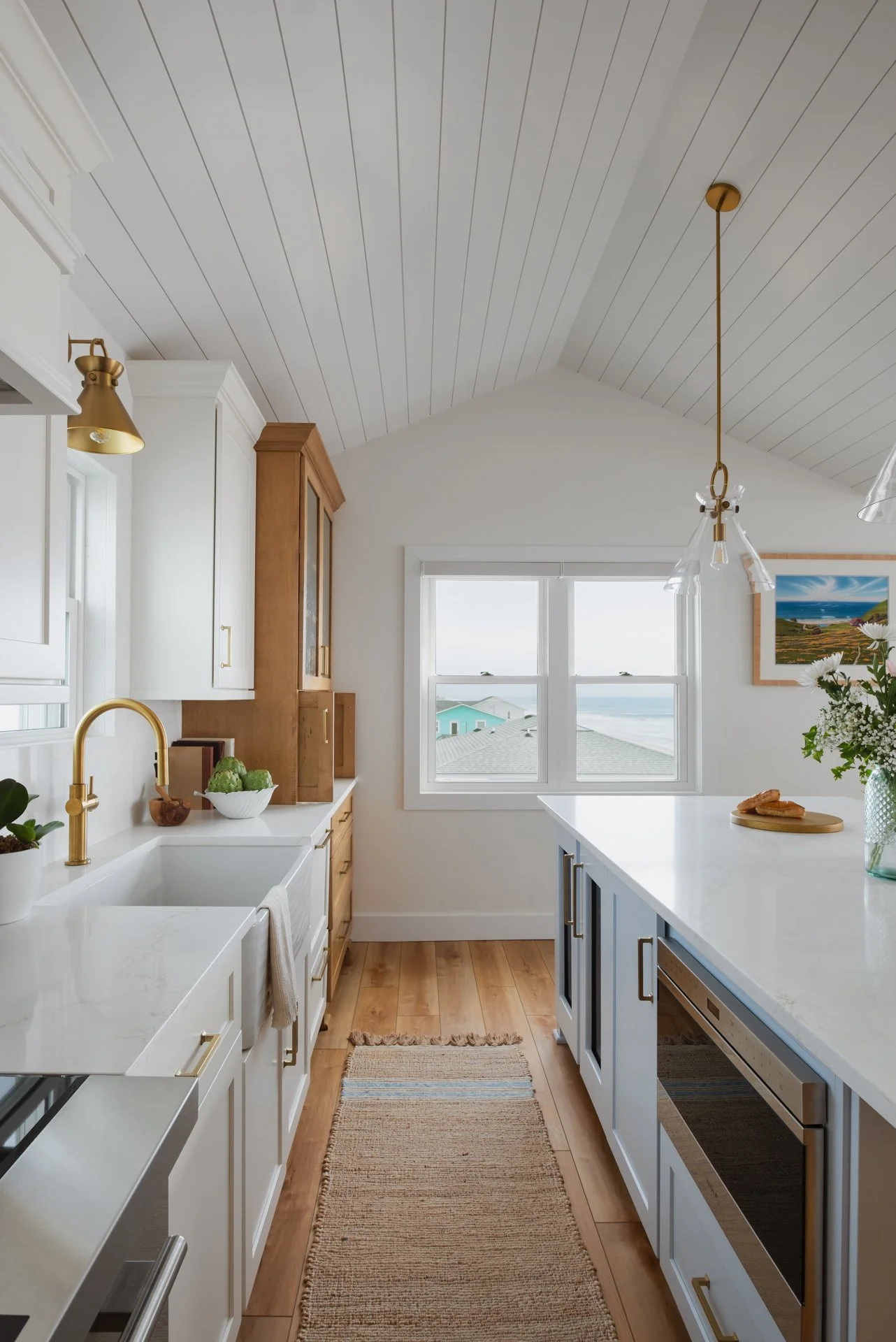 This Surf City kitchen may be small, but it works overtime. Waypoint Cabinetry in Maple Rye and Dove creates a natural two-tone palette, while concealed storage, seamless appliances, and thoughtful solutions make everyday living feel effortless — proving that a well-designed kitchen doesn't need to be large to be exceptional. Cambria Icelandic quartz countertops and a full-height quartz backsplash keep the space bright and airy, while Top Knobs hardware in Honey Bronze adds a warm metallic detail that complements the natural wood tones throughout. Woven rush barstools, a shiplap ceiling, and brass pendant lighting complete the relaxed coastal character — warm, livable, and perfectly at home on the North Carolina coast.