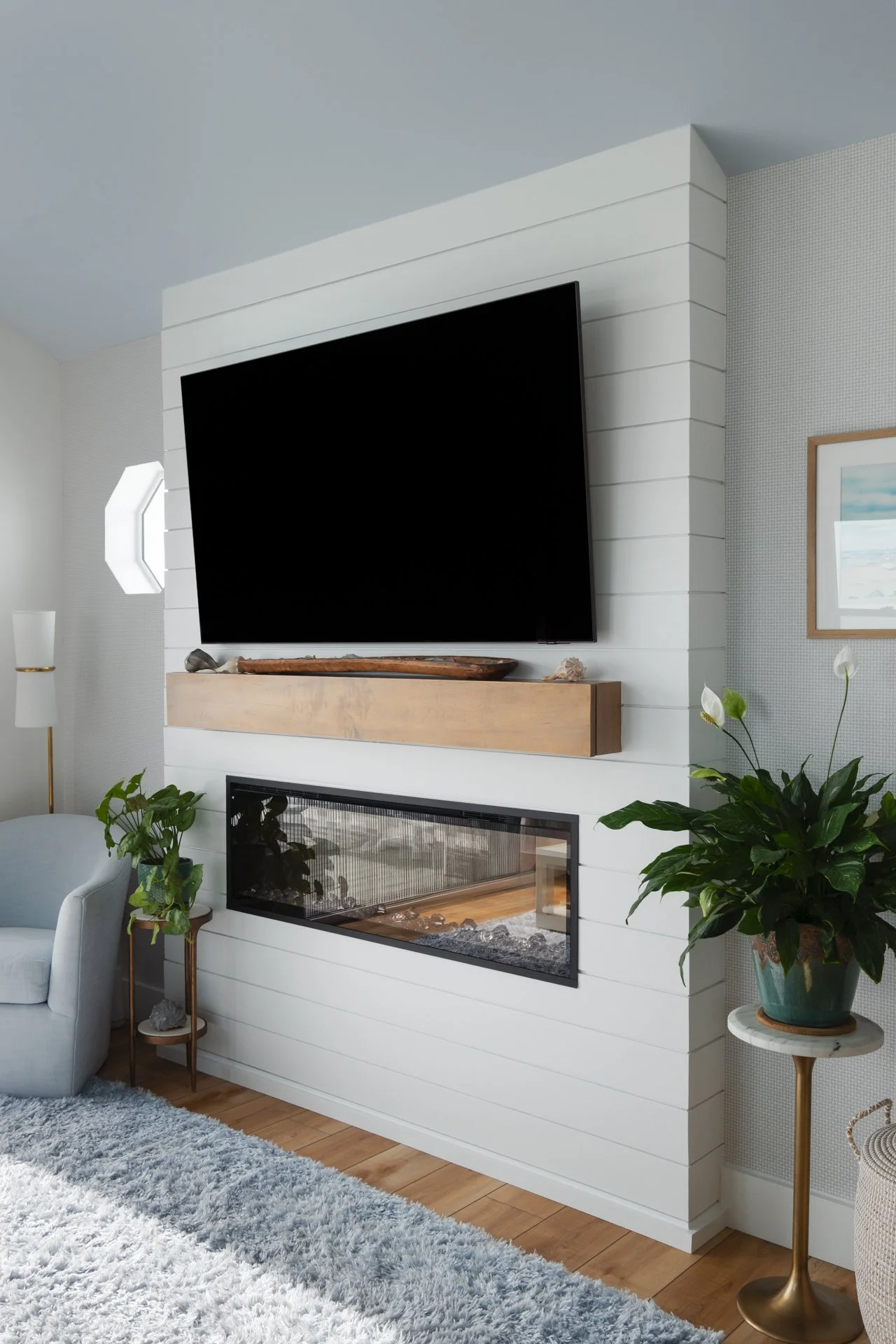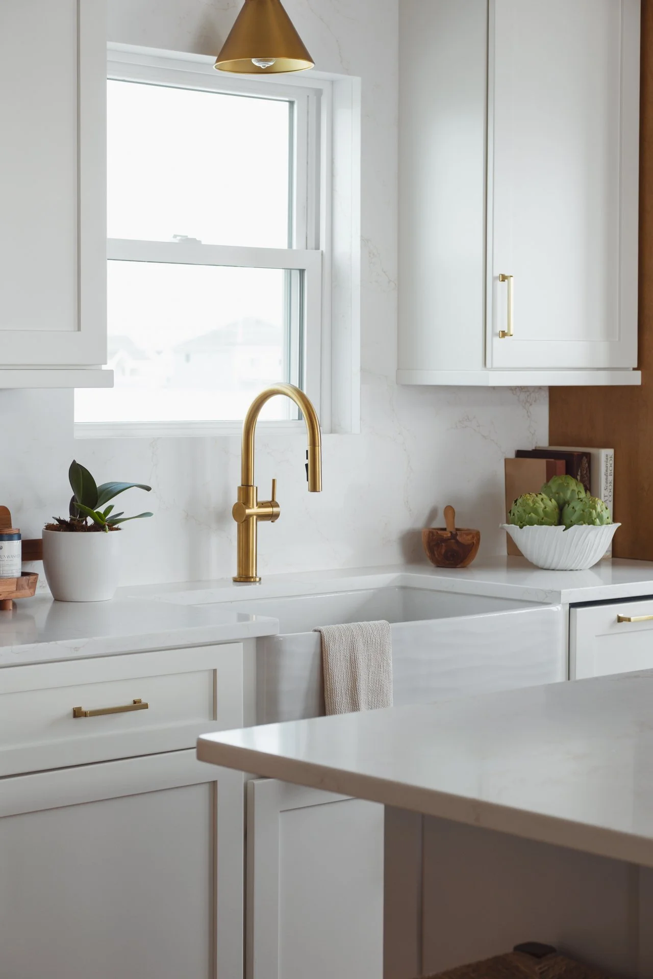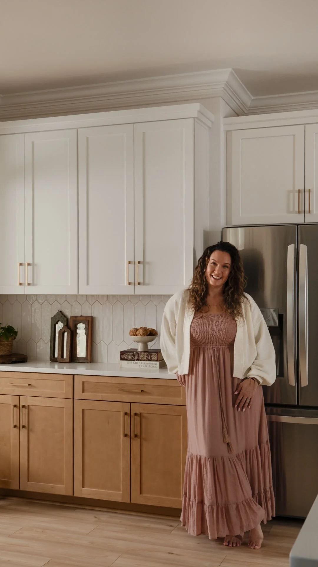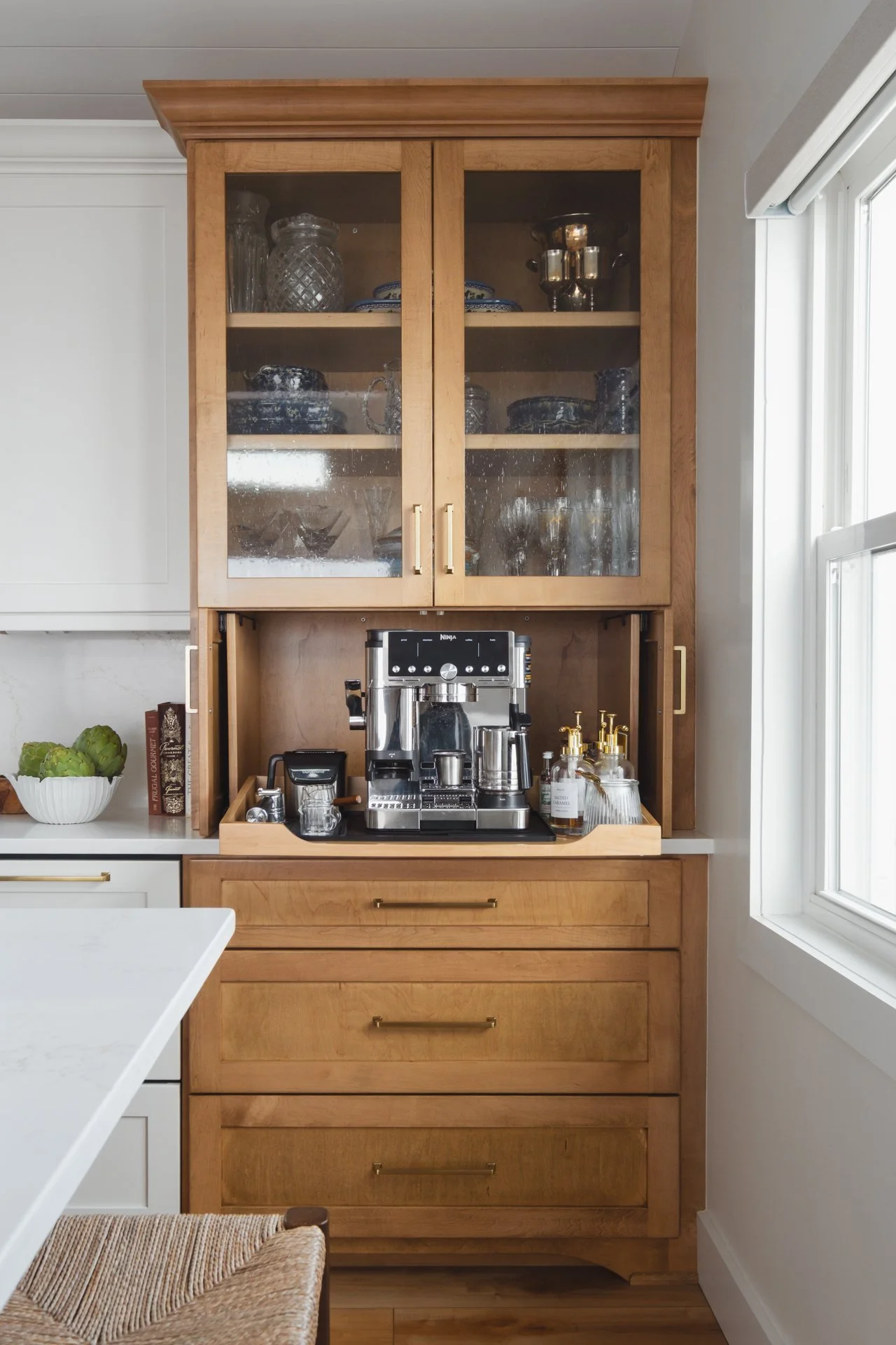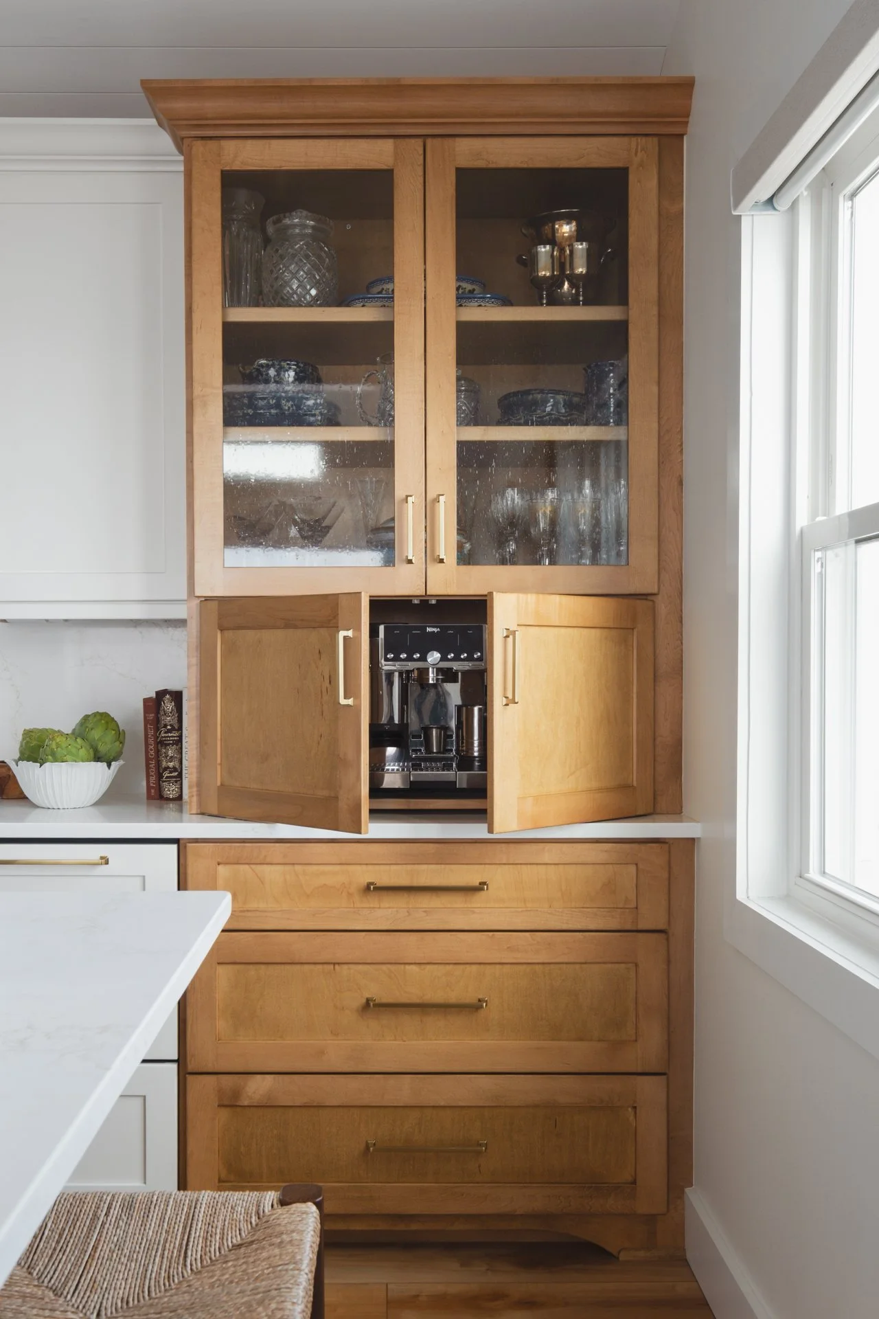 This Surf City kitchen may be small, but it works overtime. Waypoint Cabinetry in Maple Rye and Dove creates a natural two-tone palette, while concealed storage, seamless appliances, and thoughtful solutions make everyday living feel effortless — proving that a well-designed kitchen doesn't need to be large to be exceptional. Cambria Icelandic quartz countertops and a full-height quartz backsplash keep the space bright and airy, while Top Knobs hardware in Honey Bronze adds a warm metallic detail that complements the natural wood tones throughout. Woven rush barstools, a shiplap ceiling, and brass pendant lighting complete the relaxed coastal character — warm, livable, and perfectly at home on the North Carolina coast.