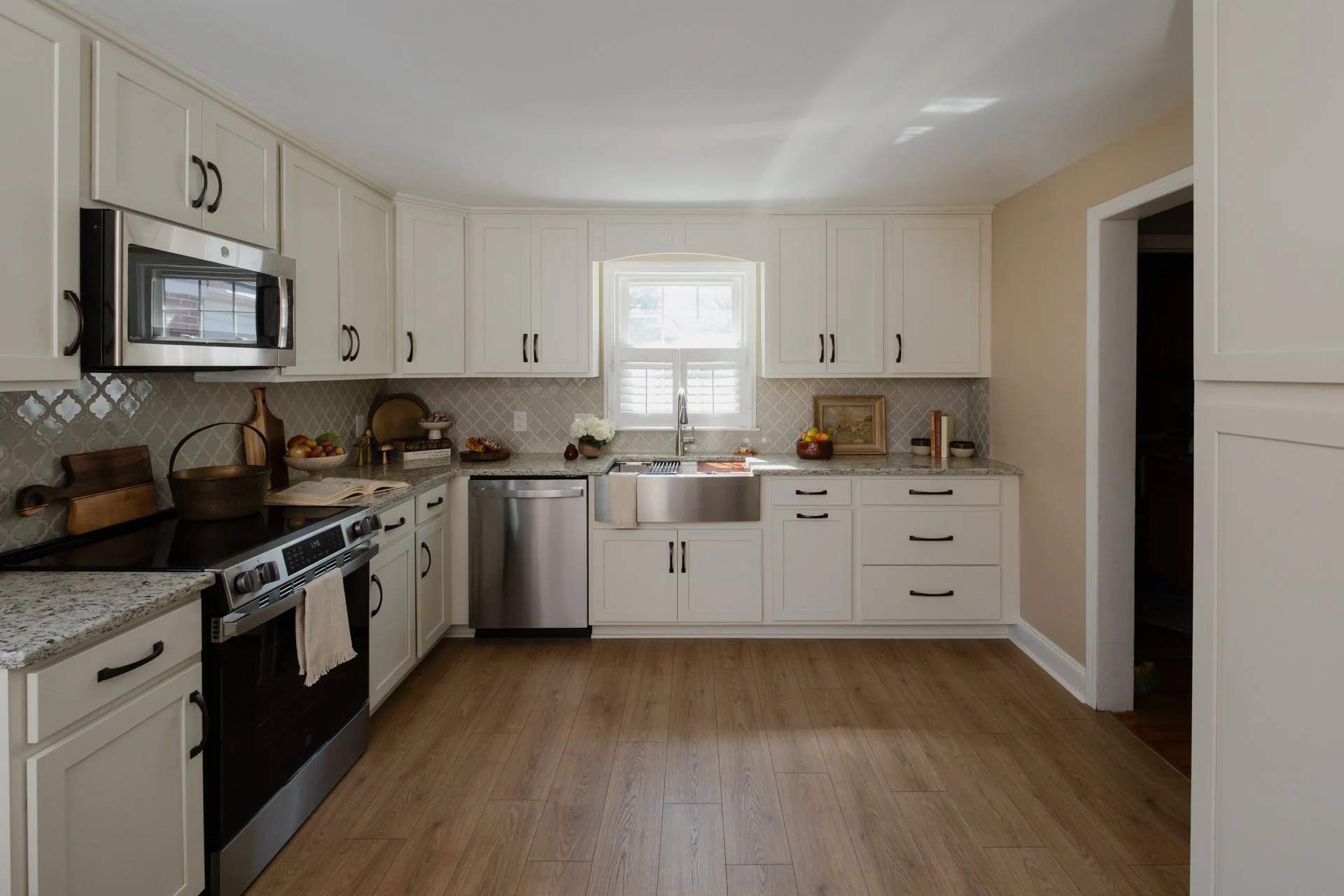 Giallo Napoly granite countertops bring warmth and subtle movement to the space, their soft golds and creams tying beautifully into the Vanilla cabinetry above. A Ruvati stainless farmhouse sink anchors the sink wall with character and function, while Florida Tile’s classic arabesque backsplash introduces a gentle, muted sage tone that bridges the warm neutrals throughout the kitchen.